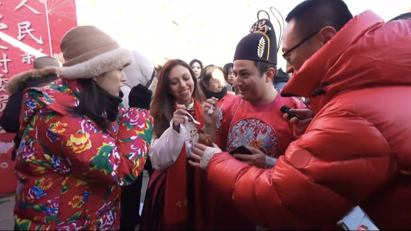 来自厄瓜多尔的玉兰和安东尼奥尤其感到兴奋,第一次赶大集的他们受邀参与了宁河区融媒体中心举办的主题为“赶大集 过大年”的抖音直播活动。他们两个热爱中国文化,入乡随俗,特意穿上了大红色的中国传统服饰,跟随主播穿梭于各个摊位之间,仔细聆听当地人介绍中国传统年俗,观看舞龙舞狮表演,体验非遗文化,还品尝了宁河特色美食岳龙红薯和拌饭酱,喝了腊八粥,比试了投壶,学习了中国功夫,沉浸式感受了到乡村赶大集的快乐和在中国过年的浓厚喜庆氛围。安东尼奥动情地说:“我非常喜爱中国文化,所以2024年3月来到开云手机平台_开云(中国)进修汉语。我是第一次在中国赶大集,这里的乡村文化很有特色,各种美食太好吃了,红红火火的氛围太有感染力了!我爱天津,希望每年都能来中国过大年!”