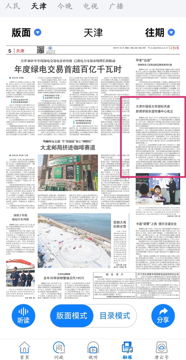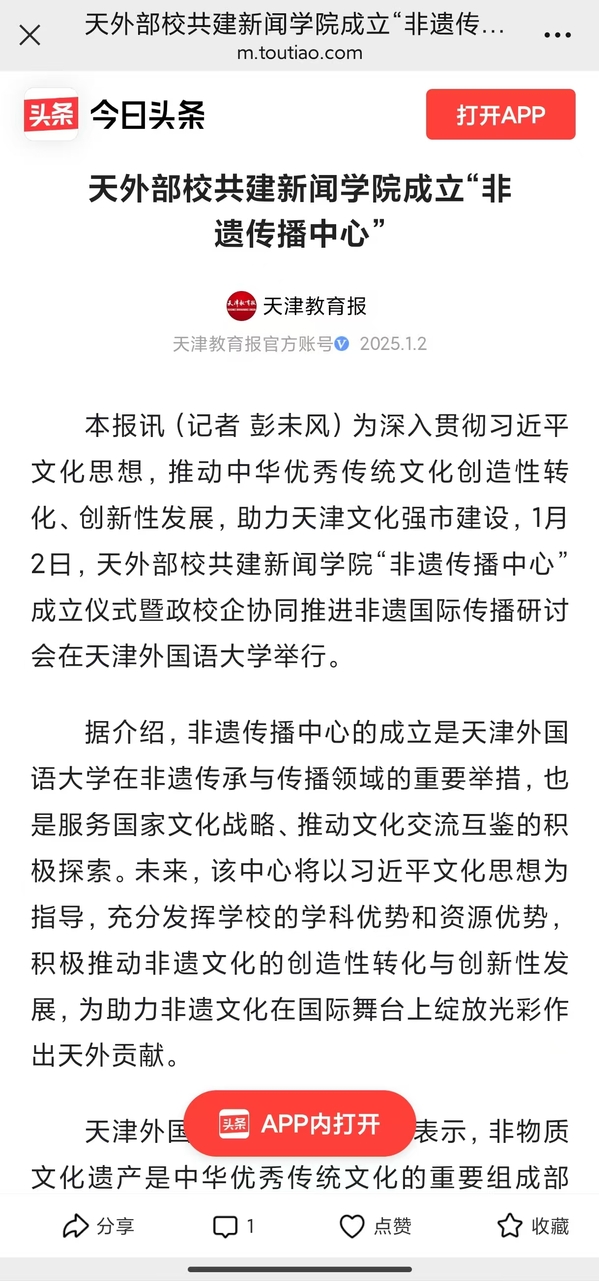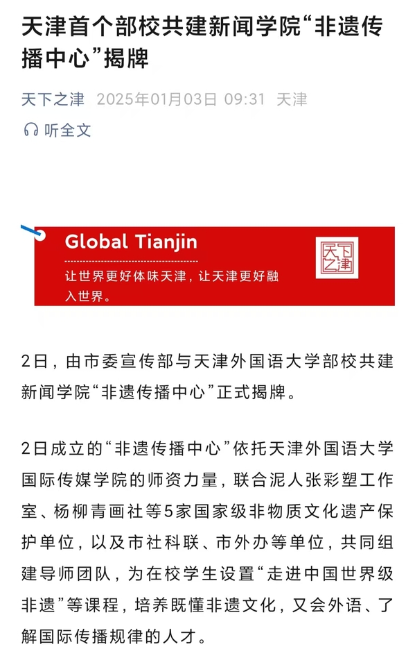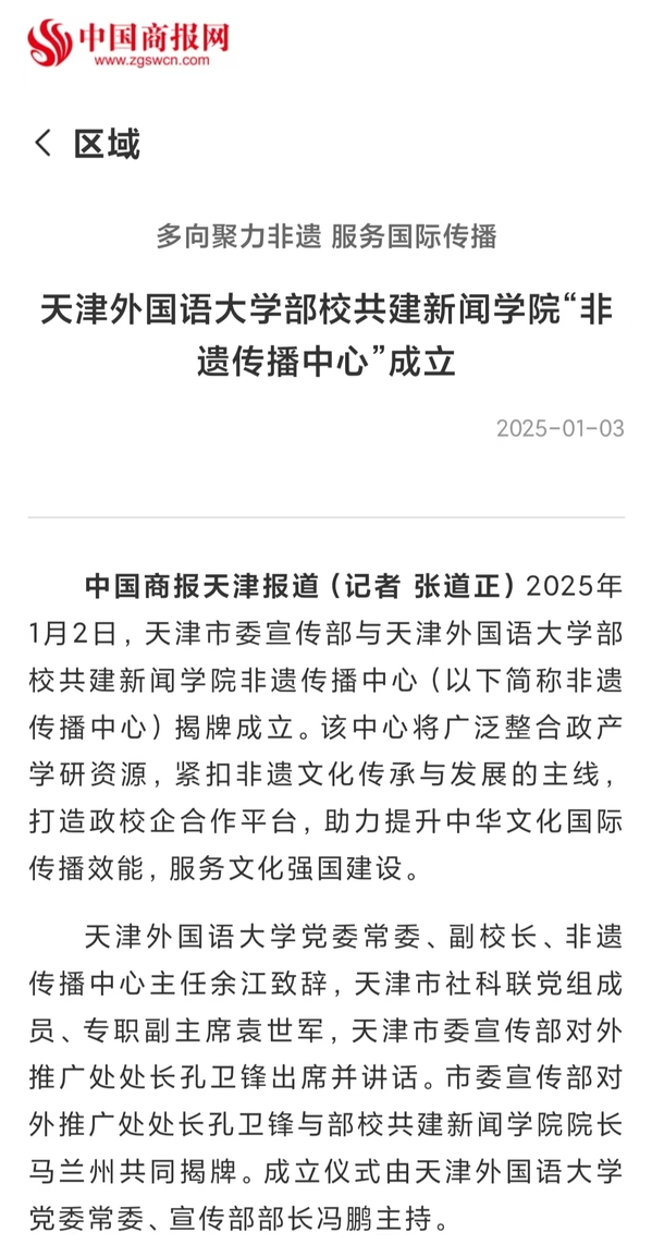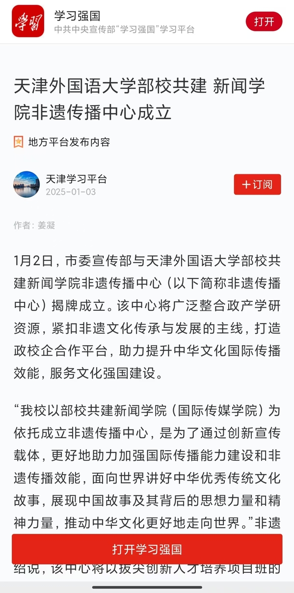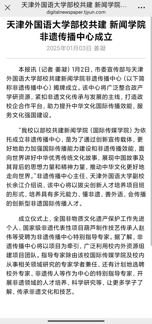 1月2日,市委宣传部与开云手机平台_开云(中国)部校共建新闻学院“非遗传播中心”在天外揭牌成立。该中心广泛整合政产学研资源,紧扣非遗文化传承与发展的主线,打造政校企合作平台,助力提升中华文化国际传播效能,服务文化强国建设。“非遗传播中心”的成立受到《中国日报》《中国商报》、学习强国、《天津日报》《天津新闻》《都市报道60分》、天下之津、津云、《天津教育报》等多家媒体的关注和报道。