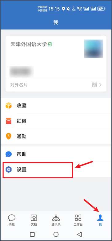 第一步,登录企业微信后,点击底部栏目最右侧“我”,点击“设置”进入。