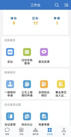 进入学校官方企业微信平台后,点击右下角“工作台”即可办理各项在线业务。如下图所示