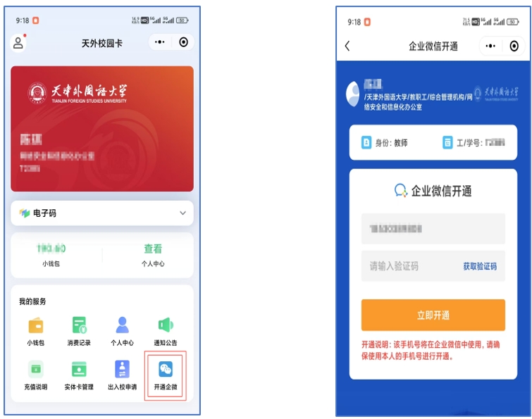 第一步,进入微信‘天外校园卡’小程序,点击右下角应用‘开通企微’按钮(下图左)