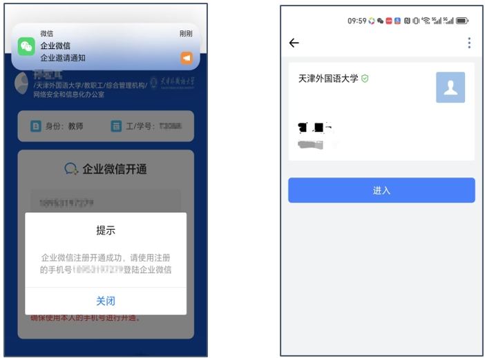第四步,验证码核验完成后,将收到企业微信邀请(下图左),启动企业微信APP后,用注册的手机号登录即可使用企微(下图右)。