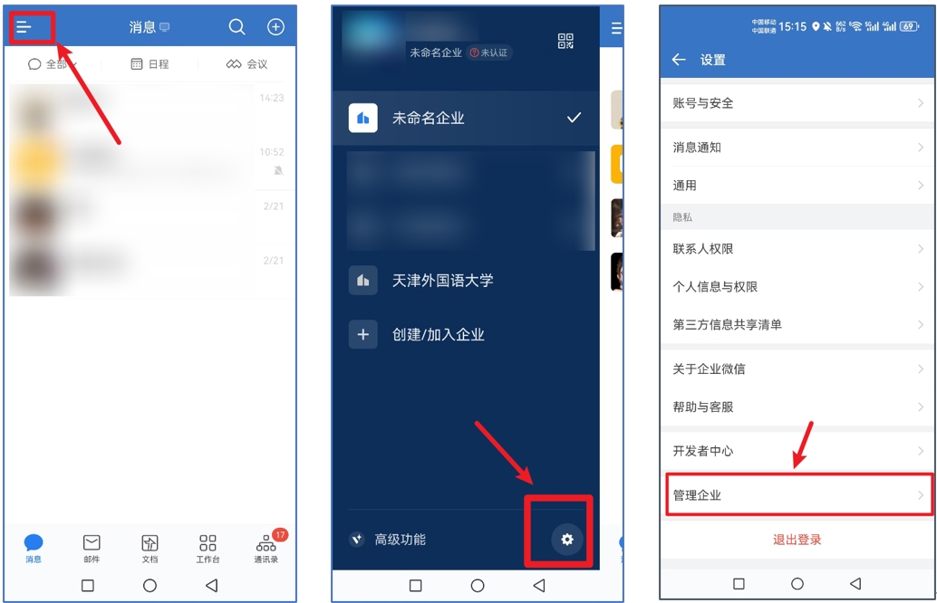 学校官方企微没有开通“邀请加入”机制,请不要邀请同事加入“未命名企业”,也不要接受其他邀请。学校官方企业微信名称为“开云手机平台_开云(中国)”,如您加入了“未命名企业”,请按“附件1”的方式退出未命名企业,
