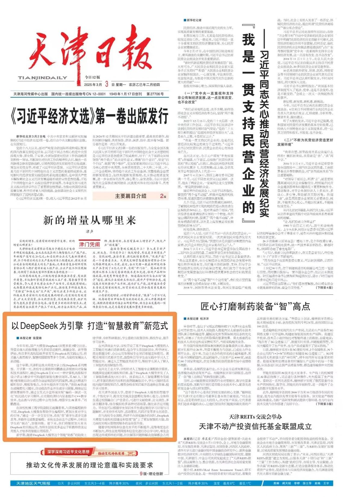 3月3日,《天津日报》头版刊登《以DeepSeek为引擎 打造“智慧教育”新范式》,来看看我市高校如何开展有关DeepSeek的实践应用,将其融入教育教学、智慧校园管理等多个方面,为高校发展注入新动能——