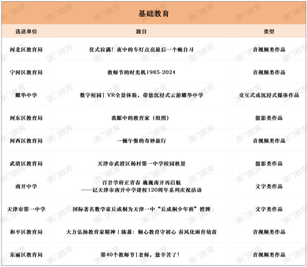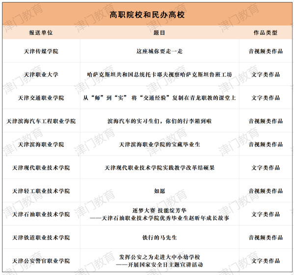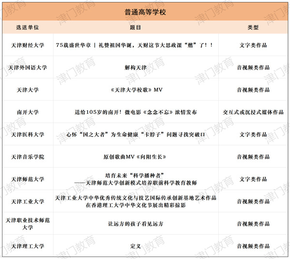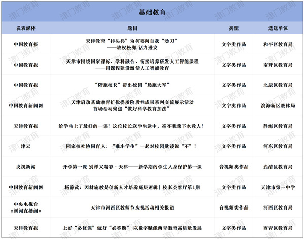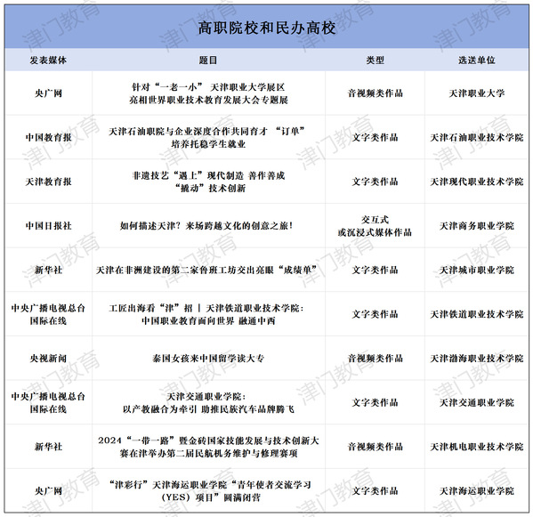 为深入学习贯彻习近平文化思想、习近平总书记视察天津重要讲话精神和关于教育的重要论述,贯彻落实全国和我市教育大会精神,进一步加强教育新闻舆论工作,市教育两委组织开展了2024年度天津市“十大教育新闻作品”评选活动。经自主申报、专家评审、网上公示,最终评定两个组别(新闻媒体组、单位创作组)三个领域(普通高等学校、高职院校和民办高校、基础教育)各10件作品为2024年度天津市“十大教育新闻作品”。