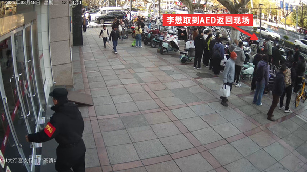 鲁芋甫的同学李懋虽然不是医学专业,但从小一直接受急救知识教育,他第一时间去旁边的南京银行大行宫支行寻找AED(自动体外除颤器),银行工作人员龚诗婕二话不说就将AED拿给了李懋。