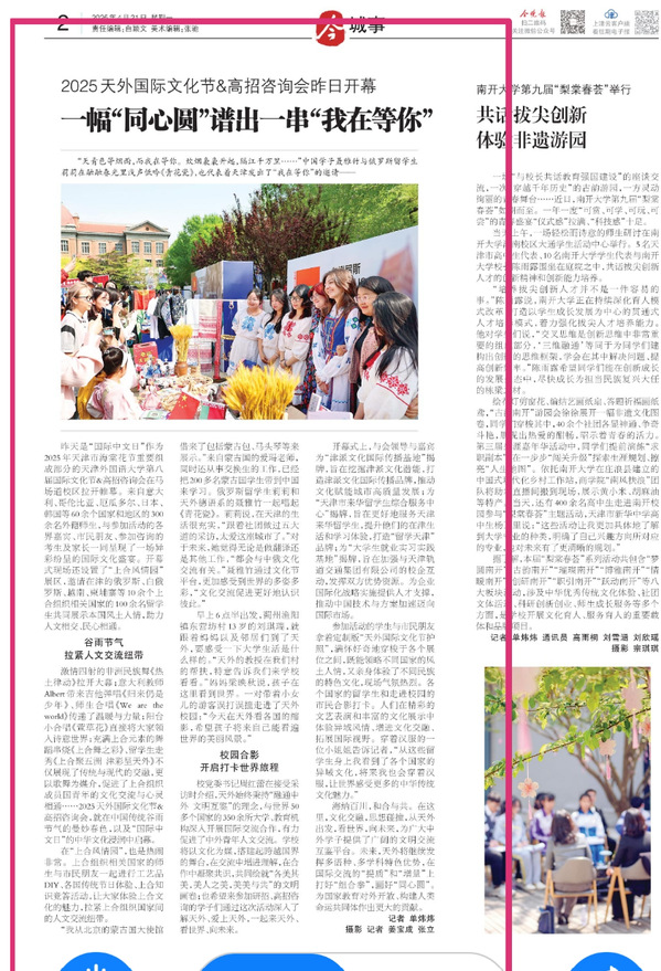 昨天是“国际中文日”作为2025年天津市海棠花节重要组成部分的开云手机平台_开云(中国)第八届国际文化节&高招咨询会在马场道校区拉开帷幕。来自意大利、哥伦比亚、厄瓜多尔、日本、韩国等60余个国家和地区的300余名外籍师生,与参加活动的各界嘉宾、市民朋友、参加咨询的考生及家长一同呈现了一场异彩纷呈的国际文化盛宴。开幕式现场还设置了“上合风情园”展区,邀请在津的俄罗斯、白俄罗斯、越南、柬埔寨等10余个上合组织相关国家的100余名留学生共同展示本国风土人情,助力人文相交、民心相通。