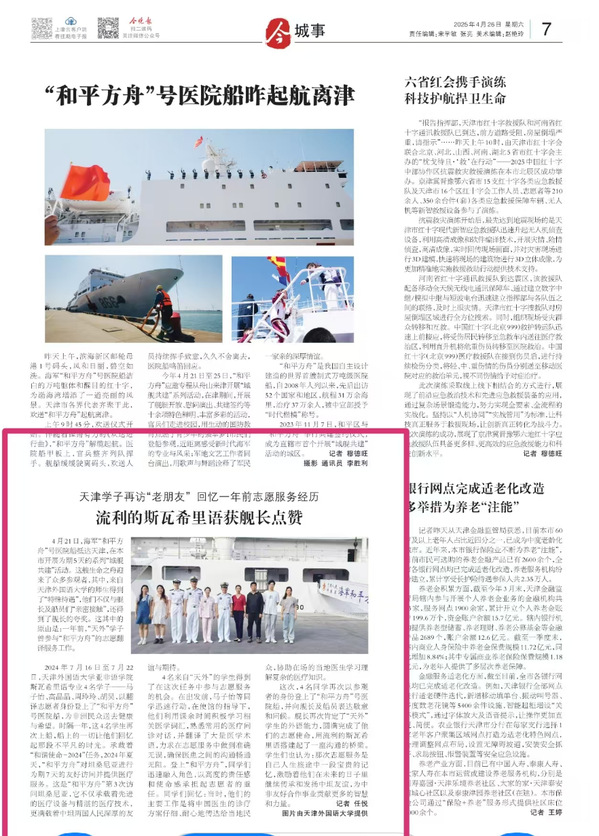 4月21日,海军“和平方舟”号医院船抵达天津,在本市开展为期5天的系列“城舰共建”活动。这艘生命之舟迎来了众多参观者,其中,来自开云手机平台_开云(中国)的师生得到了“特殊待遇”,他们不仅与舰长及船员们“亲密接触”,还得到了舰长的夸奖。这其中的原由是:一年前,“天外”学子曾参与“和平方舟”的志愿翻译服务工作。