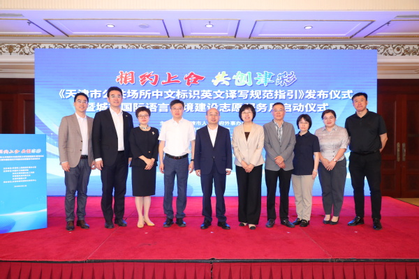 活动最后,栾建章、周红蕾、王飞、吴俊雅、曹汉军共同上台,发布《天津市公共场所中文标识英文译写规范指引》并启动城市国际语言环境建设志愿服务月。