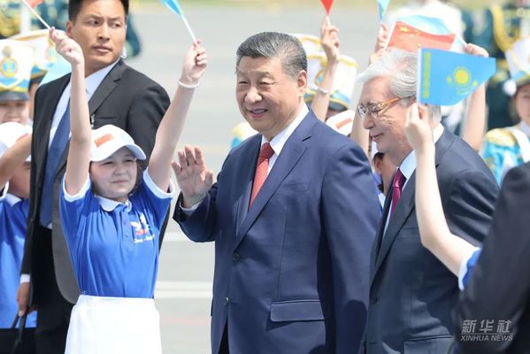 习近平抵达阿斯塔纳纳扎尔巴耶夫国际机场时,托卡耶夫总统率总统办公厅主任达杰拜、副总理兼外长努尔特列乌、总统外事顾问卡济汉、阿斯塔纳市长卡瑟姆别克等高级官员热情迎接。身着盛装的哈萨克斯坦女青年向习近平献花。礼兵分列蓝地毯两侧致敬,哈萨克斯坦少年儿童手持中哈两国国旗热烈欢迎习近平到访。习近平在托卡耶夫陪同下观看仪仗队分列式,直升机悬挂中哈国旗从机场上空飞过。在机场贵宾楼内,两国元首还共同欣赏哈萨克斯坦少年儿童的文艺表演。