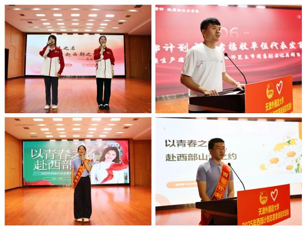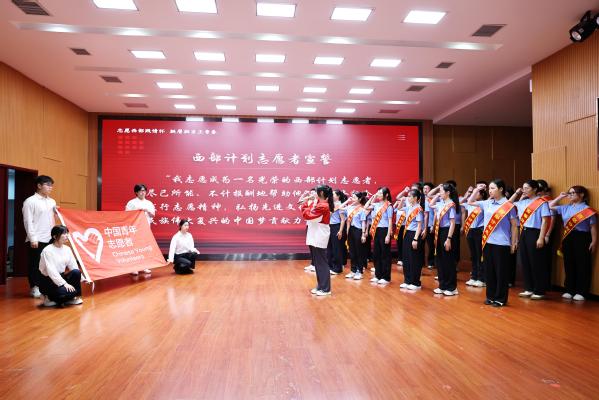 在往届西部计划志愿者张越的带领下,全体西部计划志愿者庄严宣誓,在铿锵誓言中担起报效祖国、建功西部的新使命,共同拉开长卷,以“到西部去,到基层去,到祖国最需要的地方去。请学校放心,我们出发了!”的铿锵口号,展现出他们投身西部的坚定信念。