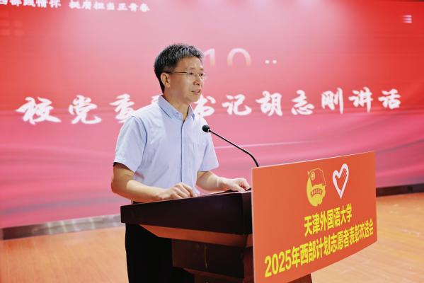 欢送会上,校党委副书记胡志刚为西部计划志愿者代表授旗并讲话,充分肯定了志愿者们满怀青春激情奔赴西部的决心,展现了天外学子勇于担当、无私奉献的崇高精神。并对即将奔赴祖国西部的志愿者提出三点希望:一是沉下心、俯下身,做扎根基层的“实干家”。要脚踏实地、真抓实干;二是学本事、长才干,做知行合一的“多面手”。在实践中学真知、悟真谛;三是守初心、担使命,做青春火炬的“传递者”。在西部坚守初心、勇于担当,让青春的火炬在逐梦路上代代相传。