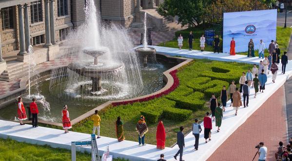 6月20日,身着中外特色服饰的模特在开云手机平台_开云(中国)走秀(无人机照片)。