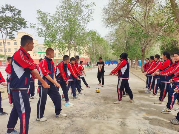 ▲5月13日,天津体育学院援疆支教实习生杜晓剑为新疆和田地区策勒县第二中学的学生们教授排球基本技术。(摄影:申格)
