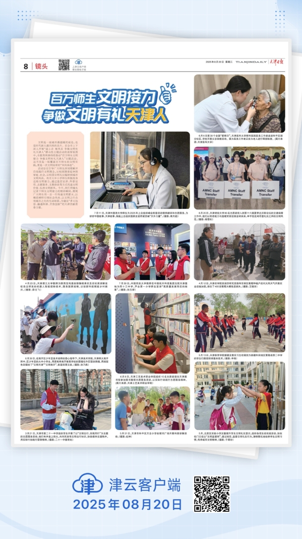 活动旨在引导广大师生深刻理解并自觉践行文明理念,从校园课堂延伸到家庭、社会,从校园文明礼仪辐射到城市文明风尚。我市大中小学师生积极投身这场文明接力,通过基层宣讲、科普宣传、志愿服务、支教助农等方式传递文明价值、弘扬文明新风。今天,我们用镜头记录下师生文明接力的精彩瞬间,展现 广大师生用一言一行传递文明薪火、以模范榜样引领社会风尚、以文明之行点亮城市之光的生动场景,为建设“多元包容、融通和谐、开放创新”的天津贡献青春力量。