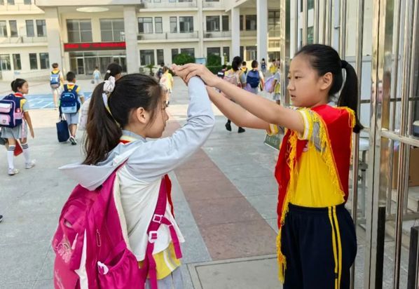 ▲5月,北辰区实验小学注重提升学生文明礼仪意识,组织各项生动实践活动,如在校门口设立“文明监督岗”,通过规范、监督日常礼仪行为,潜移默化地培养学生文明习惯,传承城市文明精神。(摄影:于璟玢)