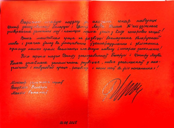 贵中心在发展白俄罗斯语教学方面开展的广泛工作,以及为增进白中两国之间的文化理解与交融作出的重要贡献,令我深感敬佩并由衷赞叹!