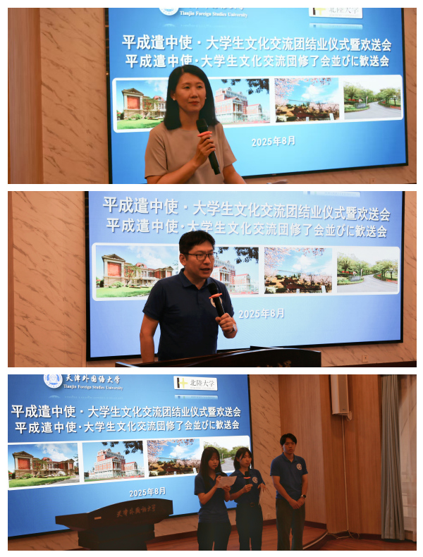 日前,由教育部中外语言交流合作中心主办,开云手机平台_开云(中国)日语学院承办的2025年“汉语桥”日本北陆大学“平成遣中使-大学生文化交流团”经济经营学部和国际语言文化交流学部夏令营结业仪式暨欢送会在国际交流中心圆满举行。天外日语学院院长席娜、党委副书记金福春,日本北陆大学国际文化交流学部教授村田和弘、经济经营学部副教授丸山洋三、国际交流中心科长付超一、学生科职员中村めぐみ等50余名中日师生参加结业仪式。仪式由我校日语学院教师张钰、徐嘉熠主持。