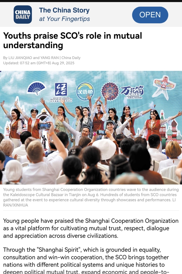 Young people have praised the Shanghai Cooperation Organization as a vital platform for cultivating mutual trust, respect, dialogue and appreciation across diverse civilizations.
