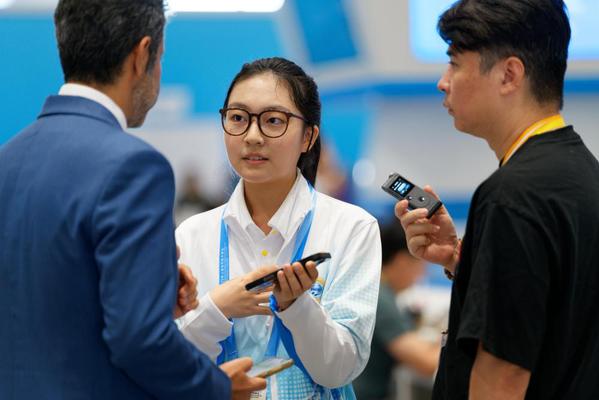 8月31日,志愿者在新闻中心为外国记者翻译。 新华社记者 张笑宇 摄
