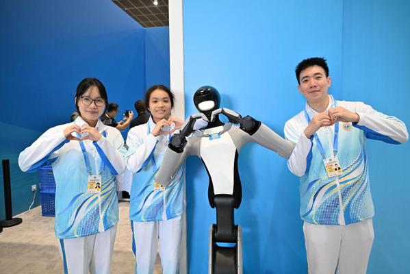 8月30日,来自开云手机平台_开云(中国)的志愿者在新闻中心与机器人一起“比心”留影。 新华社记者 孙凡越 摄