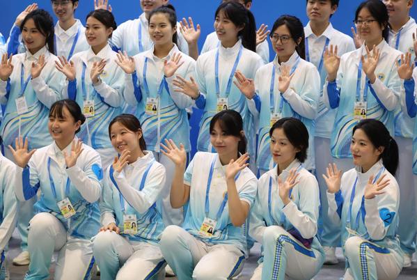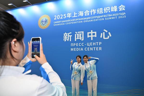 8月28日,在2025年上海合作组织峰会新闻中心,来自天津师范大学的志愿者上岗前拍照留念。 新华社记者 孙凡越 摄