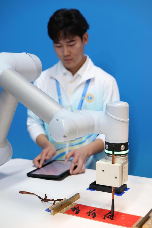 8月29日,志愿者在新闻中心操控智能机器人展示书法。 新华社记者 杨青 摄