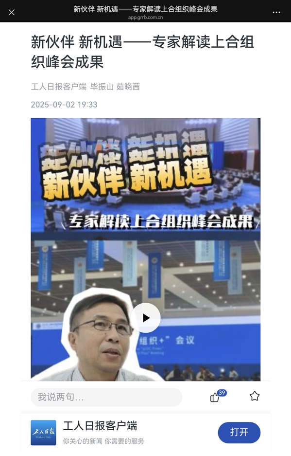 【相约上合】《工人日报》客户端聚焦专家解读上合组织峰会成果,记者专访我校科研处处长、国际关系学院院长李强,报道其对上合组织发展前景的解读和展望。