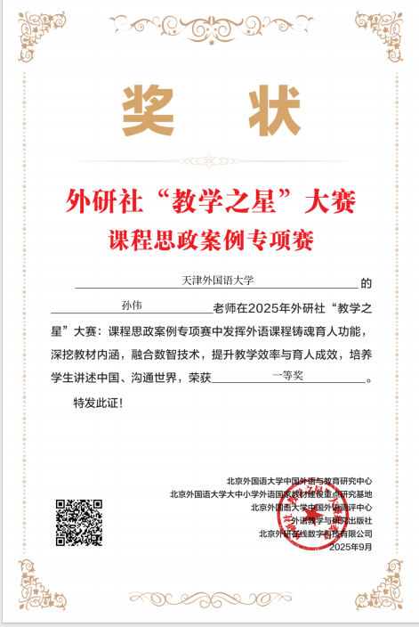近日,天外通识教育学院教师孙伟在2025年外研社“教学之星”课程思政案例专项赛中荣获一等奖。该赛事以“外语教材的有效使用:讲述中国 沟通世界”为主题,旨在搭建沟通交流外语课程思政育人实践的平台,全面提升课程思政建设深入性、创新性与有效性,助力高校服务国家战略、培养堪当民族复兴重任的时代新人。