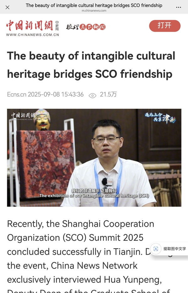 Recently, the Shanghai Cooperation Organization (SCO) Summit 2025 concluded successfully in Tianjin. During the event, China News Network exclusively interviewed Hua Yunpeng, Deputy Dean of the Graduate School of Translation and Interpretation at Tianjin Foreign Studies University and an intangible cultural heritage (ICH) interpreter for the SCO Summit 2025. While presenting ICH projects to foreign leaders, Hua skillfully combined Chinese wisdom with cultural depth. From storytelling that brought Yangliuqing woodblock new year pictures to life, to tea art interpretations intertwined with Silk Road legends, his approach highlighted cultural diversity in a subtle yet profound manner.