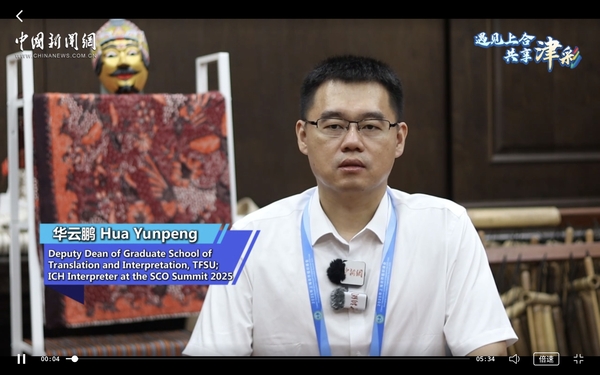 【相约上合】上合峰会期间,中新社专访了我校高级翻译学院副院长、上合组织天津峰会非遗讲解员华云鹏。报道通过中新社全媒体平台发布,并由中央网信办向全网推送。