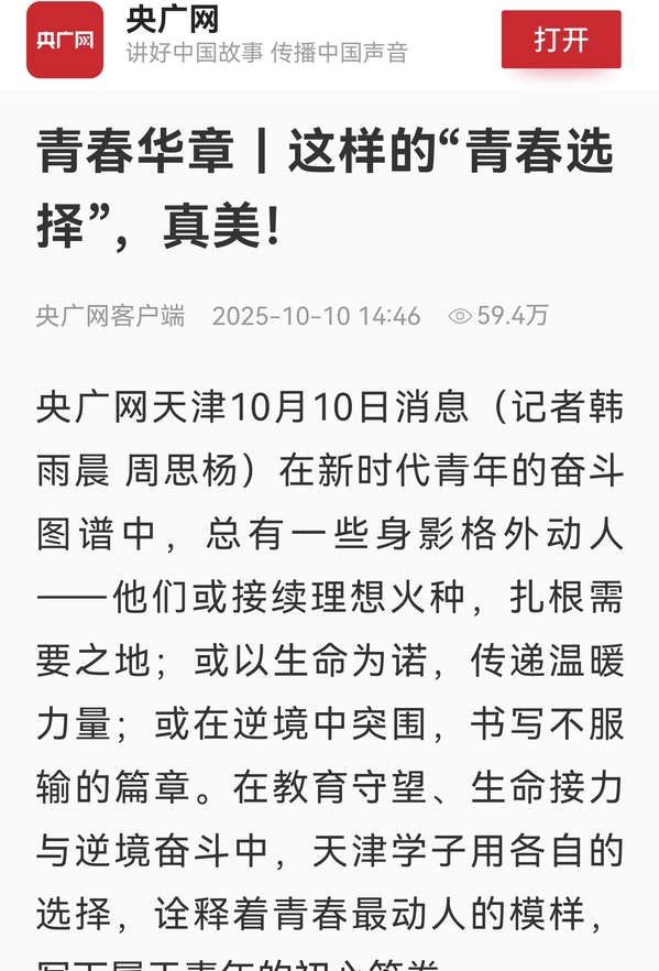 央广网天津10月10日消息(记者韩雨晨 周思杨)在新时代青年的奋斗图谱中,总有一些身影格外动人——他们或接续理想火种,扎根需要之地;或以生命为诺,传递温暖力量;或在逆境中突围,书写不服输的篇章。在教育守望、生命接力与逆境奋斗中,天津学子用各自的选择,诠释着青春最动人的模样,写下属于青年的初心答卷。