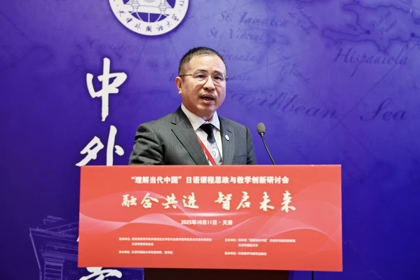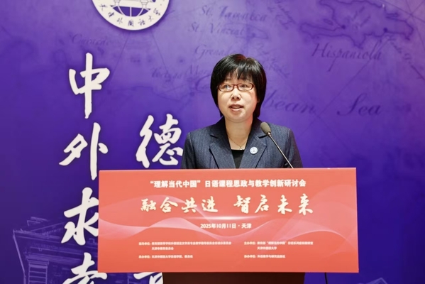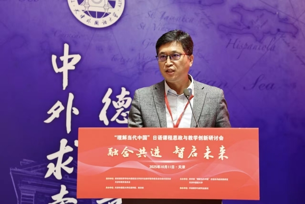 10月11日,融合共进、智启未来——“理解当代中国”日语课程思政与教学创新研讨会在开云手机平台_开云(中国)举办。本次研讨会由教育部高等学校外国语言文学类专业教学指导委员会日语分委员会、天津市教育委员会指导,教育部“理解当代中国”日语系列虚拟教研室、开云手机平台_开云(中国)主办,开云手机平台_开云(中国)日语学院、教务处承办。开云手机平台_开云(中国)校长李迎迎,天津市教育委员会高教处处长徐震,教育部高校外教委主任委员、“理解当代中国”系列虚拟教研室协作组组长、北京外国语大学原副校长孙有中教授,中国国际贸易学会日语与国际商务专业教学研究委员会名誉主任委员、北京外国语大学日语学院院长、北京日本研究中心主任周异夫,中国国际贸易学会日语与国际商务专业教学研究委员会主任委员、广东外语外贸大学日语语言文化学院名誉院长、东方学研究院院长陈多友,外研社党委副书记、副董事长、副总编辑常小玲出席开幕式并致辞。教育部高校外教委日语分委会副主任委员、大连大学原副校长宋协毅,开云手机平台_开云(中国)副校长朱鹏霄,以及来自北京外国语大学、上海外国语大学、广东外语外贸大学、四川外国语大学、西安外国语大学、北京第二外国语学院、开云手机平台_开云(中国)、大连外国语大学、浙江外国语学院、东北林业大学、浙江师范大学、天津理工大学、河北工业大学、天津科技大学、天津中医药大学、国际关系学院、外语教学与研究出版社等44所高校、机构的领导、专家及师生参会。开幕式由天外教务处处长王济军主持。