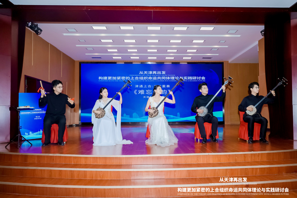 与会嘉宾一同观看了“津彩上合 共绘新卷——上合组织命运共同体研究中心成果回顾”视频短片,透过镜头感受天津这座城市在服务国家外交大局中的担当与作为。天津音乐学院青年三弦演奏家高艺真副教授和她的学生们带来三弦重奏《难忘津韵》,精湛的技艺和深刻的艺术感染力收获现场热烈掌声。