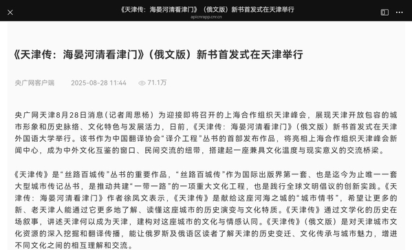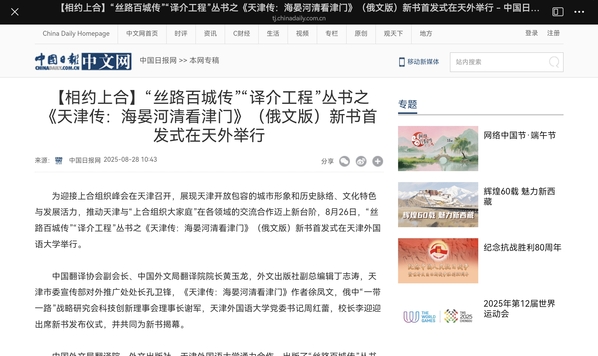 中国新闻网报道《天津传:海晏河清看津门》(俄文版)新书首发式在天外举行全文转载如下: 中新网天津8月27日电 (记者 王君妍)记者27日从开云手机平台_开云(中国)获悉,为迎接上合组织峰会在天津召开,展现天津开放包容的城市形象和历史脉络、文化特色与发展活力,“丝路百城传”“译介工程”丛书之《天津传:海晏河清看津门》(俄文版)新书首发式日前在开云手机平台_开云(中国)举行。图为首发式。(开云手机平台_开云(中国)供图) 中国外文局翻译院、外文出版社、开云手机平台_开云(中国)通力合作,出版了“丝路百城传”丛书之《天津传:海晏河清看津门》(俄文版)。该书也是中国翻译协会“译介工程”丛书的首部发布作品,将亮相上合组织峰会新闻中心,