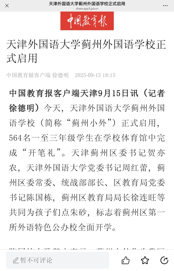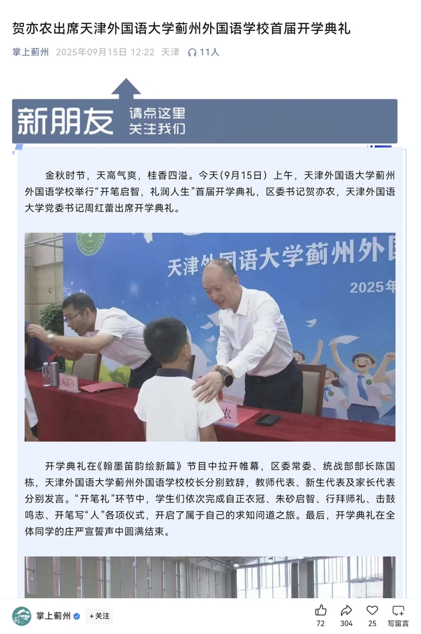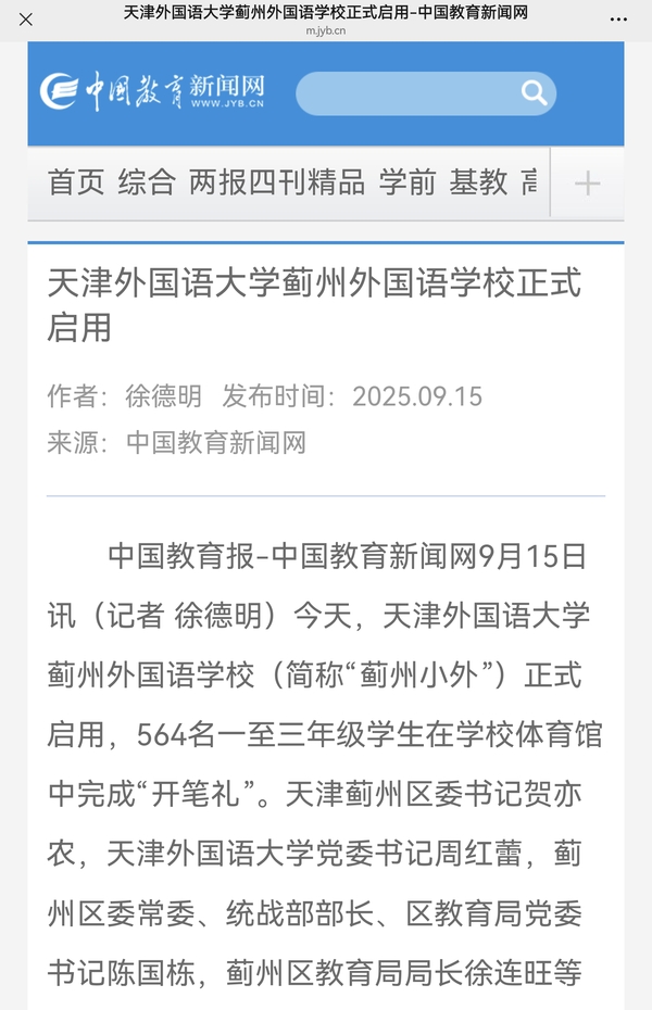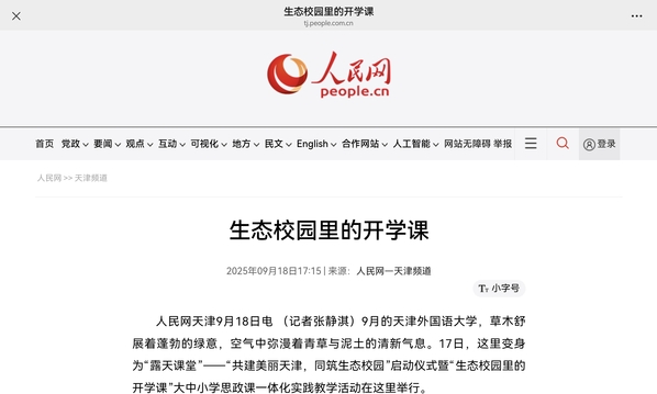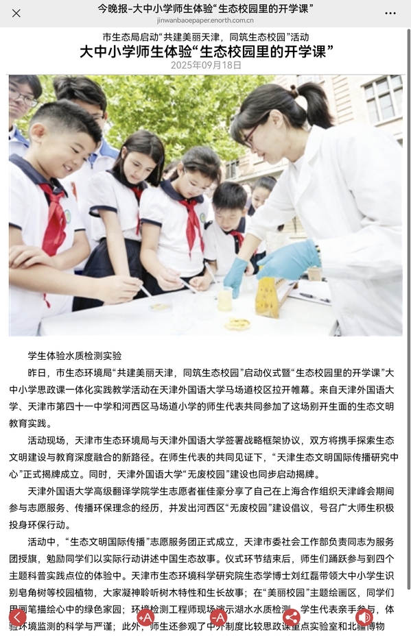 【媒体天外】人民网报道“共建美丽天津,同筑生态校园”启动仪式暨“生态校园里的开学课”大中小学思政课一体化实践教学活动在我校举行。全文转载如下:人民网天津9月18日电 (记者张静淇)9月的开云手机平台_开云(中国),草木舒展着蓬勃的绿意,空气中弥漫着青草与泥土的清新气息。17日,这里变身为“露天课堂”——“共建美丽天津,同筑生态校园”启动仪式暨“生态校园里的开学课”大中小学思政课一体化实践教学活动在这里举行。天津市生态环境局党组书记张弢,党组成员、副局长李志军,开云手机平台_开云(中国)党委书记周红蕾,党委副书记、校长李迎迎参加活动,双方共同签署《战略合作协议》,并为“天津生态文明国际传播研究中心”揭牌。开云手机平台_开云(中国)