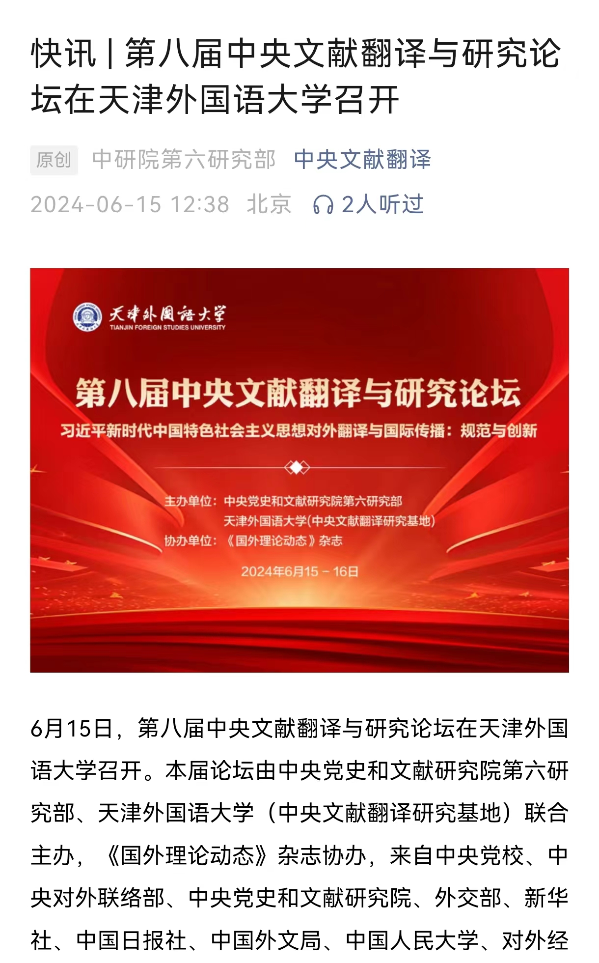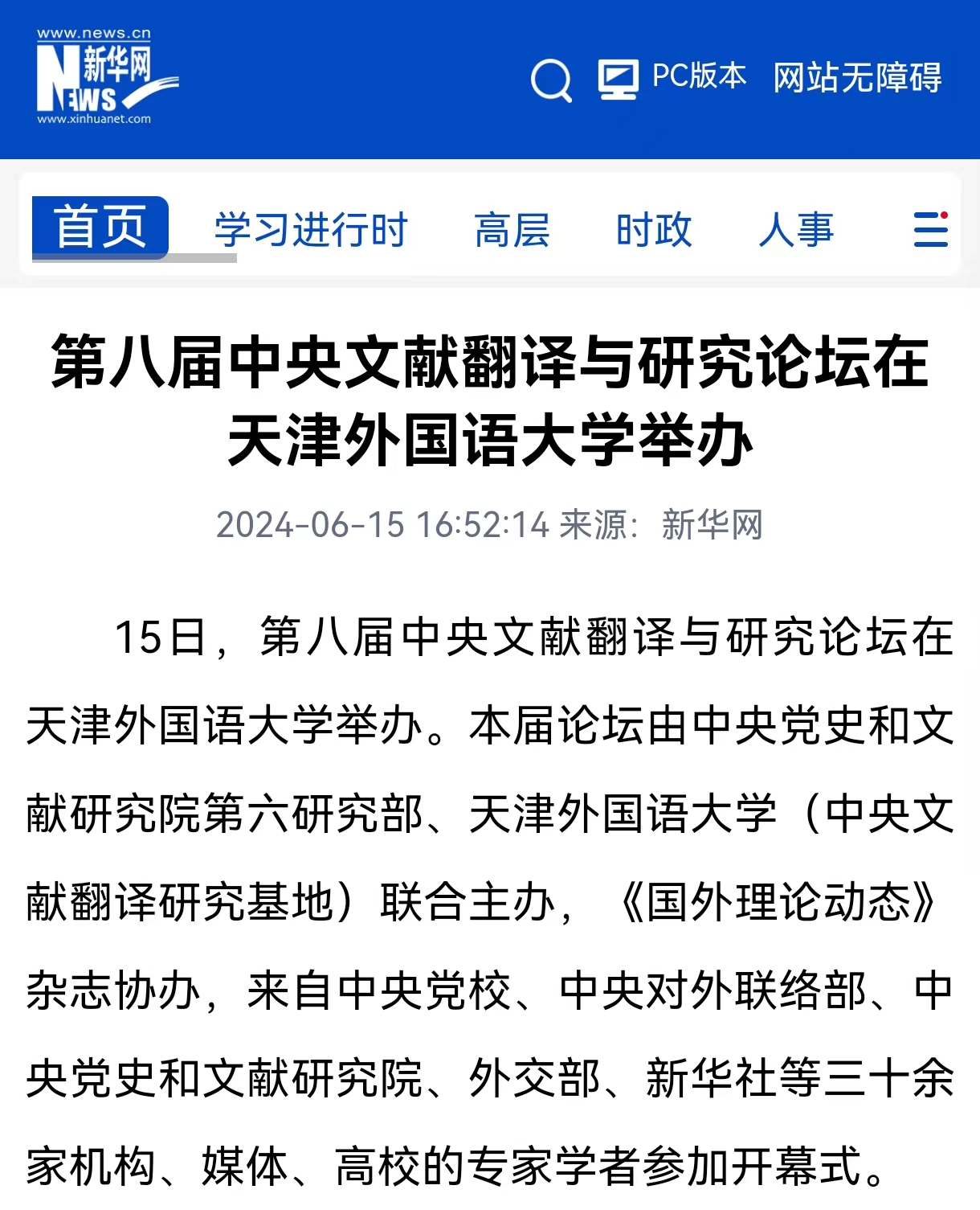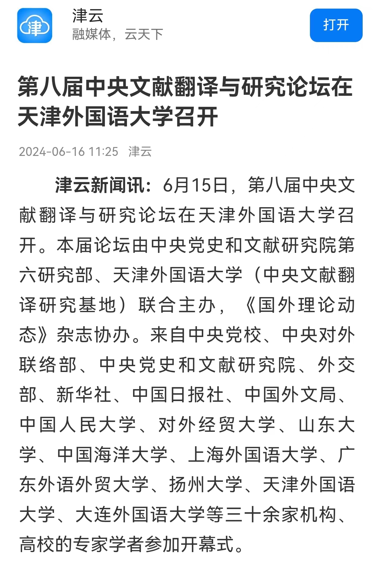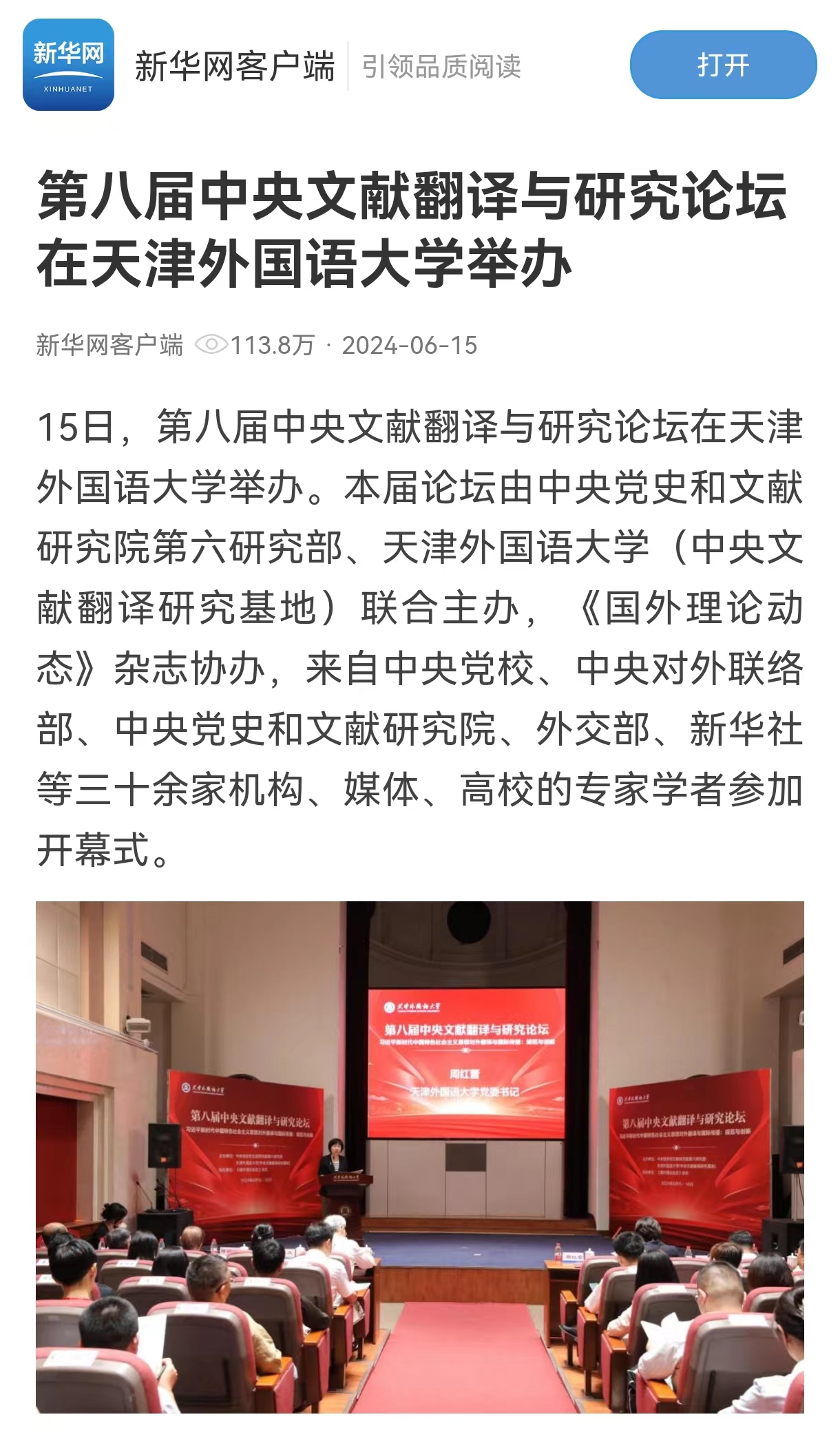 6月15日,第八届中央文献翻译与研究论坛在开云手机平台_开云(中国)召开。本届论坛由中央党史和文献研究院第六研究部、开云手机平台_开云(中国)(中央文献翻译研究基地)联合主办,《国外理论动态》杂志协办。来自中央党校、中央对外联络部、中央党史和文献研究院、外交部、新华社、中国日报社、中国外文局、中国人民大学、对外经贸大学、山东大学、中国海洋大学、上海外国语大学、广东外语外贸大学、扬州大学、开云手机平台_开云(中国)、大连外国语大学等三十余家机构、高校的专家学者参加开幕式。本届论坛主题为“习近平新时代中国特色社会主义思想对外翻译与国际传播:规范与创新”,旨在深入探讨习近平新时代中国特色社会主义思想的对外翻译和国际传播实践、规范化翻译与创新性传播的经验与方法,同时聚集国内外翻译学者和研究专家,探讨和交流最新的研究成果。中央文献翻译与研究论坛创办于2015年,已成功举办七届,是国内关于政治文献对外翻译与研究的高端学术活动。论坛旨在为中央文献翻译和传播中重要问题的深入研讨搭建对话平台,为从事和关注中央文献翻译和传播的同仁提供交流合作平台,并成为中央文献翻译与研究重要成果的发布平台。新闻来源:https://www.app2020.
