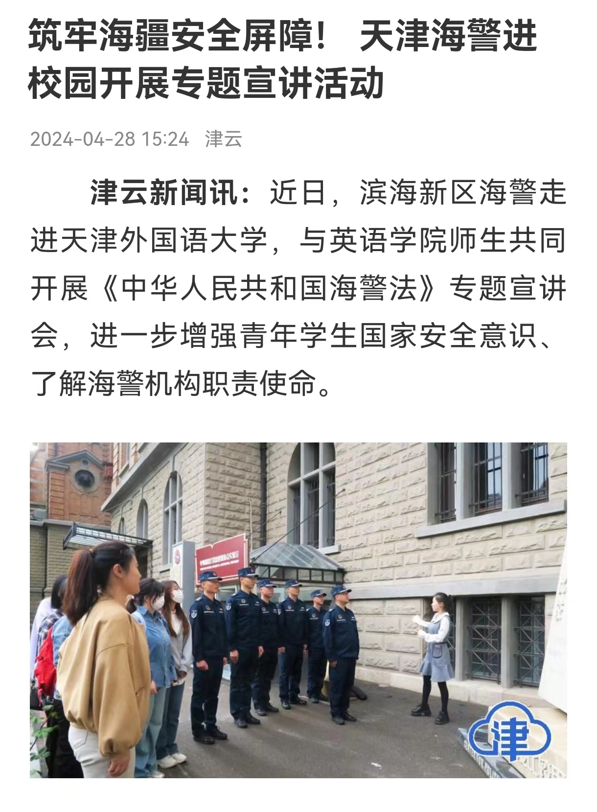 津云新闻讯:近日,滨海新区海警走进开云手机平台_开云(中国),与英语学院师生共同开展《中华人民共和国海警法》专题宣讲会,进一步增强青年学生国家安全意识、了解海警机构职责使命。活动开始前,滨海新区海警局执法员与英语学院老师及学生代表进行座谈交流,就海警的职责使命以及当前工作对语言类人才需求进行讲述,并表示欢迎高素质人才报考中国海警,共建平安海域,同学们表示毕业后会积极报考,并赠送制作的精美海报。宣讲会上,海警执法员深入浅出地阐述了《中华人民共和国海警法》的立法目的和基本内容,向大家明确了《中华人民共和国海警法》是维护国家主权、安全和海洋权益,保护公民、法人和其他组织合法权益的重要依据,也为海警执法活动提供了明确的法律依据和指导原则。同时,结合大量生动的案例,海警执法员讲述了海上巡逻、缉私查违、救助遇险等日常执法行动过程,生动体现了海警在维护海疆安全中的关键作用。宣讲会生动有趣,点燃了青年学子为筑牢海疆安全屏障贡献青春力量的决心与热情。现场学生们纷纷表示,将积极学习海警法知识,努力提升自身素质和能力,以实际行动为维护国家安全贡献自己的力量。未来,滨海新区海警局会继续推进普法进校园活动,将《中华人民共和