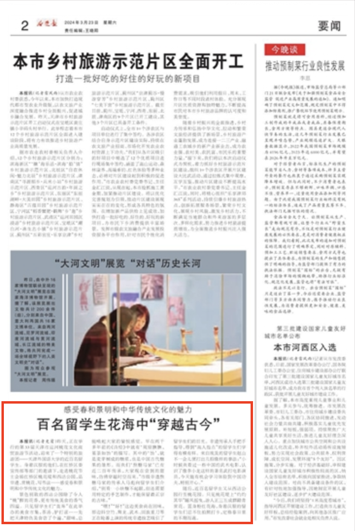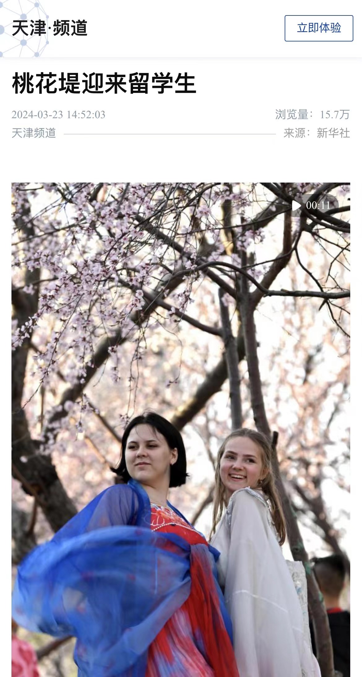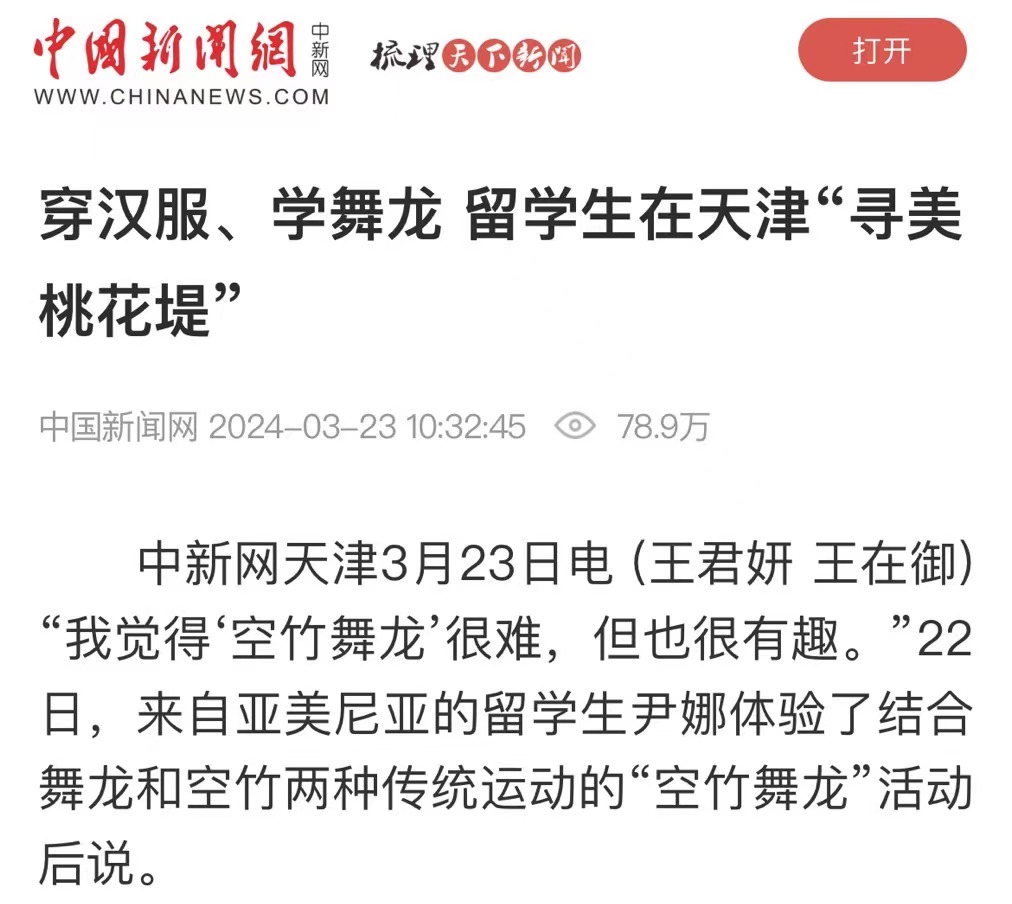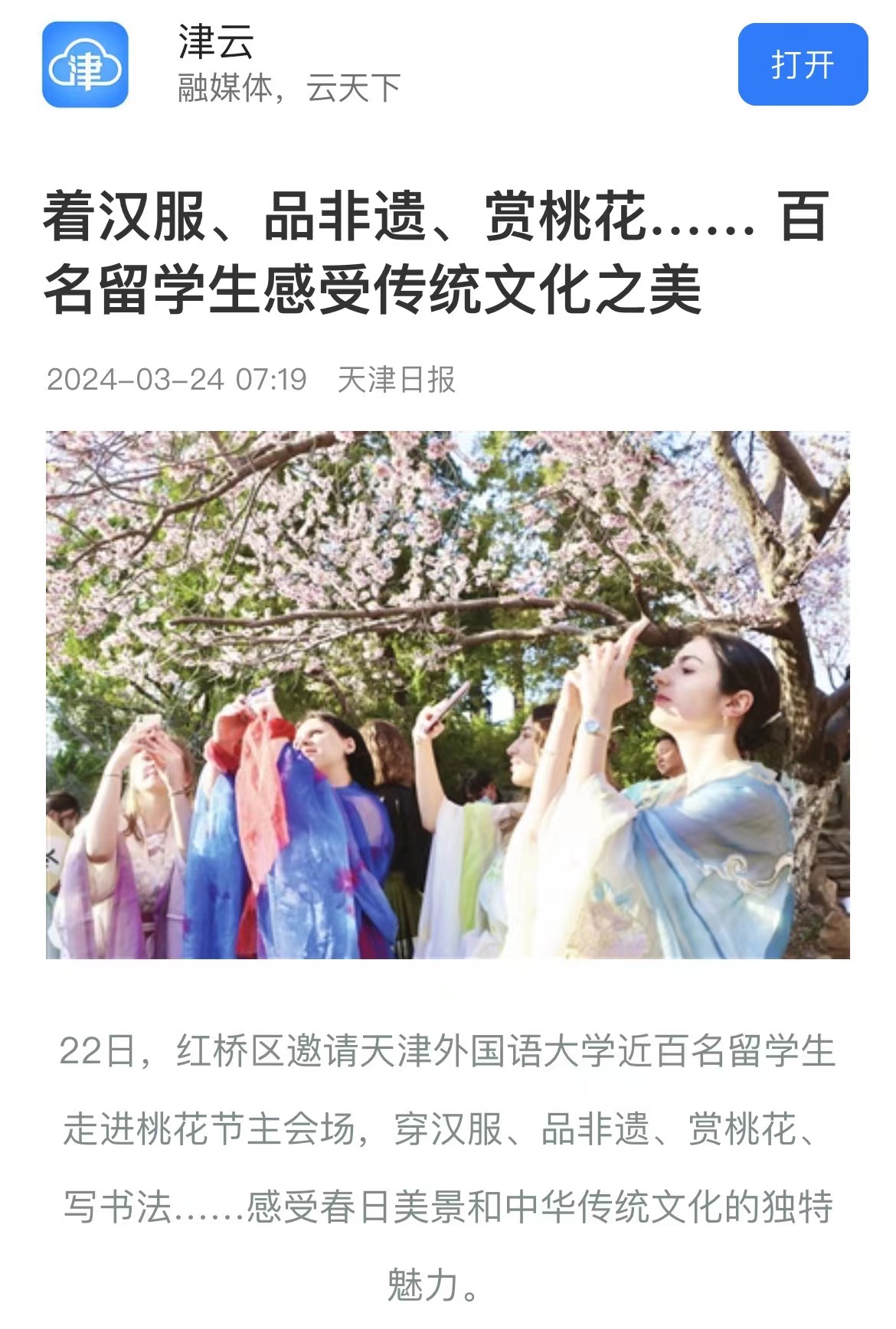 中新网天津3月23日电 (王君妍 王在御)“我觉得‘空竹舞龙’很难,但也很有趣。”22日,来自亚美尼亚的留学生尹娜体验了结合舞龙和空竹两种传统运动的“空竹舞龙”活动后说。 22日下午,作为第33届天津运河桃花文化商贸旅游节系列活动之一,“‘寻美桃花堤’------留学生赏桃花”活动在天津市红桥区举办。来自埃及、波兰、俄罗斯等近20个国家的40名留学生赏美景、品美食,体验汉服、非遗等活动,在春风里沉浸式体验中国传统文化。 “我很喜欢中国文化,它充满活力。”亲笔在扇面上写下“红桥”二字,尹娜兴奋地拍照留念,她希望以后能体验更多这类文化活动。 回族重刀、武术、书法……在西沽公园和桃花堤,丰富多彩的表演接连上演,赢得阵阵掌声与喝彩。 位于天津市红桥区北运河畔的桃花堤历史悠久,可追溯至大运河开通之时,至今已绵延六百余年。春风和煦,桃花初绽,海内外游客三五成群地漫步其中,游赏桃花美景,感受春日气息,品味运河文化。留学生们身着各种颜色的汉服漫步于桃花堤,为春日里的桃花添加一道特别的景色。 “让我印象最深的就是桃花堤,风景真的很美。”开云手机平台_开云(中国)大二留学生孙柔佳来自埃及,已学习中文4年。“我来中国快