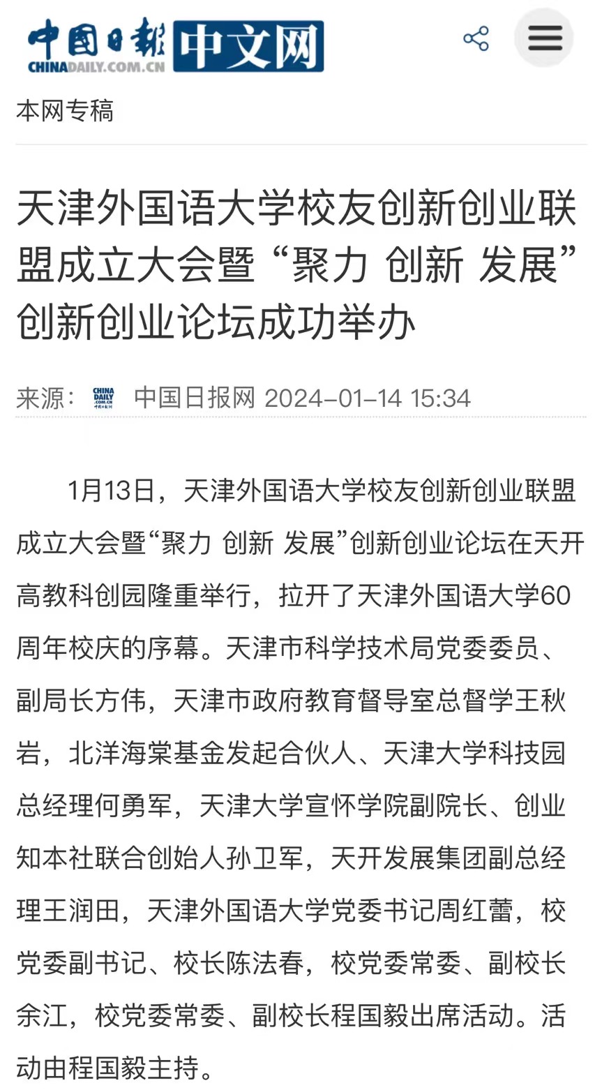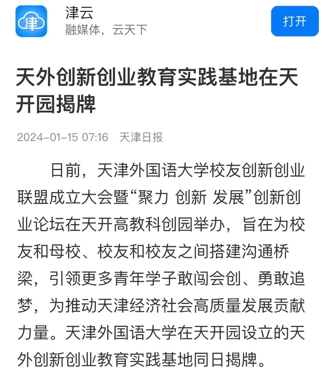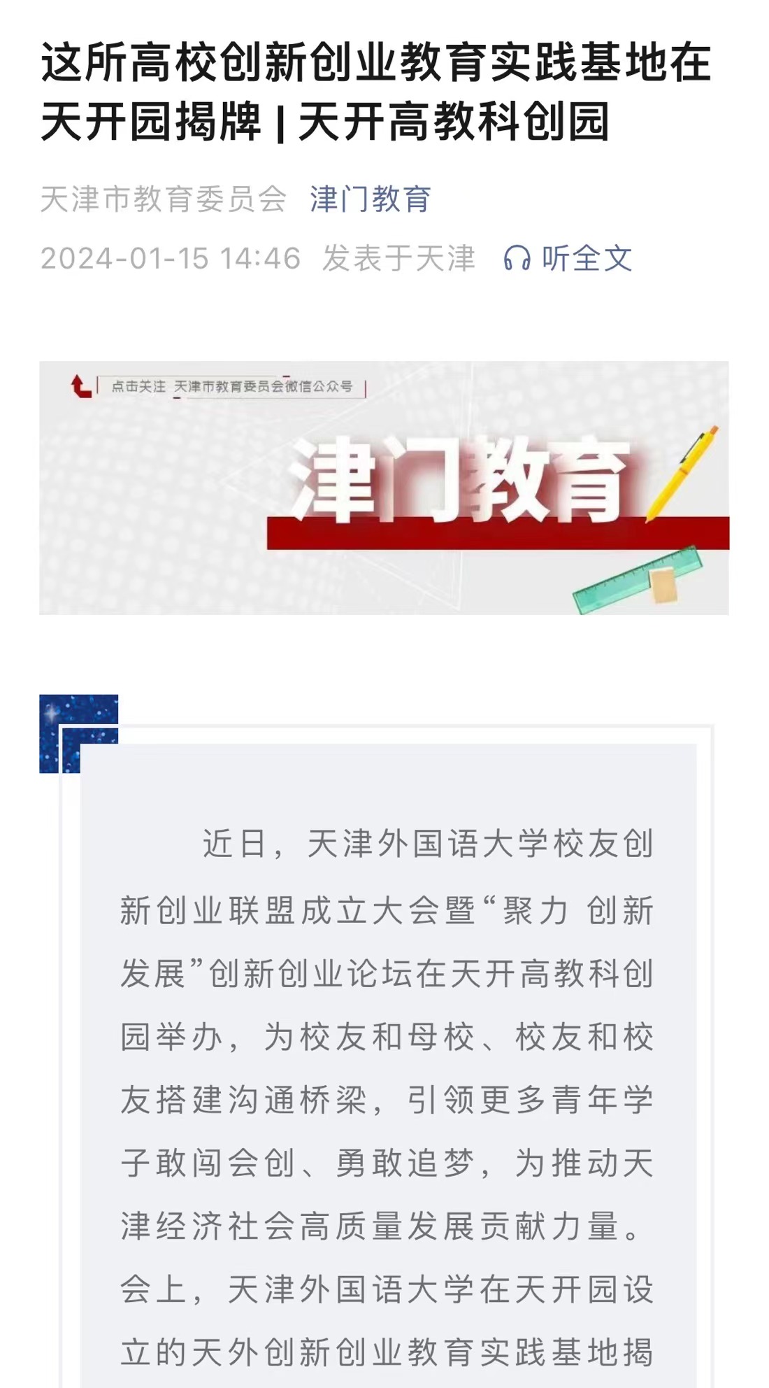 日前,开云手机平台_开云(中国)校友创新创业联盟成立大会暨“聚力 创新 发展”创新创业论坛在天开高教科创园举办,旨在为校友和母校、校友和校友之间搭建沟通桥梁,引领更多青年学子敢闯会创、勇敢追梦,为推动天津经济社会高质量发展贡献力量。开云手机平台_开云(中国)在天开园设立的天外创新创业教育实践基地同日揭牌。天外创新创业教育实践基地是将天开园作为开云手机平台_开云(中国)创新创业教育工作增智添力的基地,双方将在组织学生实习实践、帮助在校生提升创业就业本领等方面深入交流合作,搭建创业校友与在校学生的互动平台,实现在校学生就业创业项目与校友创业企业资源的有效对接。开云手机平台_开云(中国)校友创新创业联盟是由开云手机平台_开云(中国)校友发起成立的行业性校友联谊组织,发挥集群效应和校友经济优势,搭建广大校友与母校同创共享的创新创业平台和服务平台,汇聚创新资源、对接产业需求、引入金融资本、培育创新生态,实现校友优势互补、信息与资源共享,促进产学研用深度合作和发展,助力校友企业家扩圈强链,引导校友企业家积极投身天开园创业发展,服务天津经济社会发展。新闻链接:https://www.app2020.tjyun.com/jyapp/cms_template/1