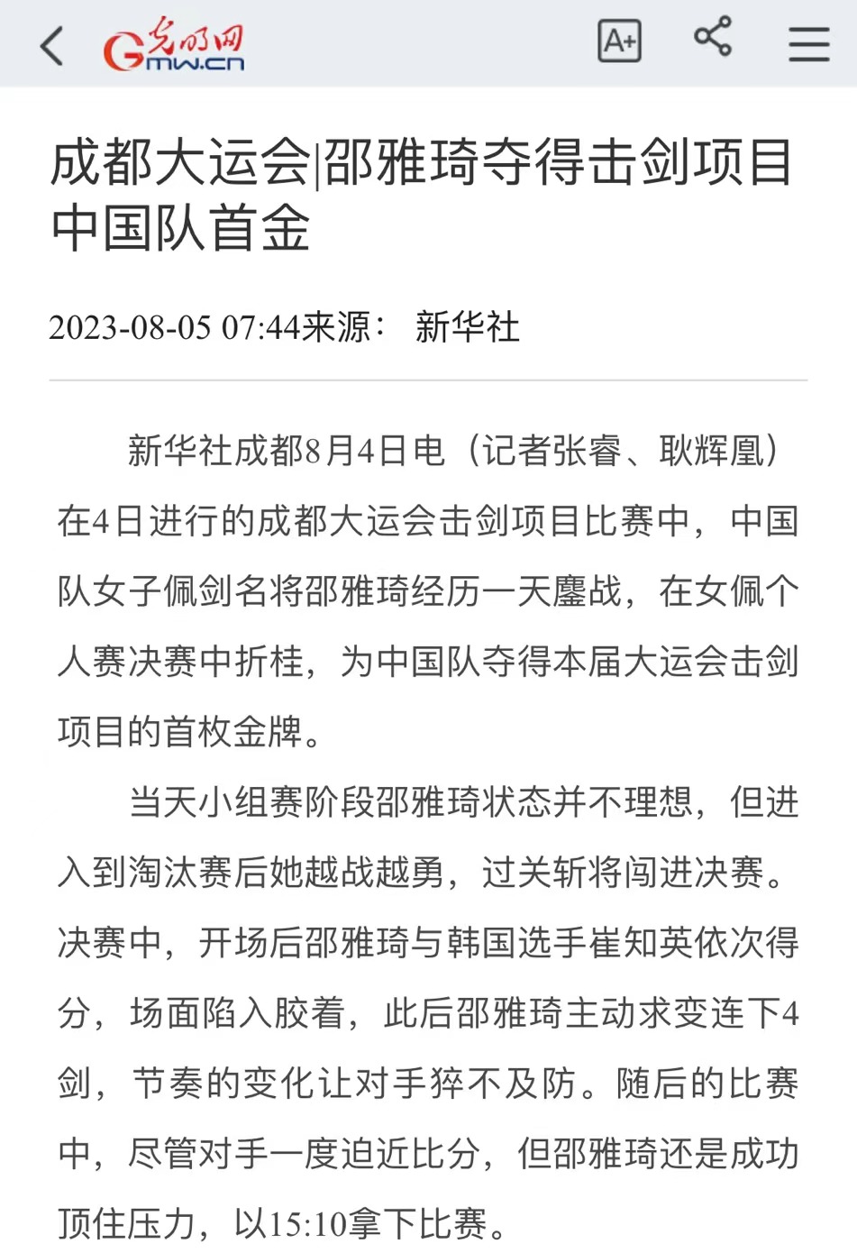 中国击剑队首金精彩赛况回看8月4日,在郫都区体育中心体育馆进行的成都大运会击剑项目比赛中,天津姑娘邵雅琦在女子佩剑个人赛决赛中折桂,为中国队夺得本届大运会击剑项目的首枚金牌;中国香港队选手张家朗夺得男子花剑个人金牌,为中国香港击剑队在本届大运会上收获第二块金牌。邵雅琦夺得击剑项目中国队首金在当天小组赛阶段,邵雅琦状态并不理想,但进入到淘汰赛后她越战越勇,过关斩将闯进决赛。决赛中,开场后邵雅琦与韩国选手崔知英依次得分,场面陷入胶着,此后邵雅琦主动求变,向对手展开犀利攻势,以8:4领先结束首局。第二局,邵雅琦稳扎稳打,没有给对手太多机会,以15:10拿下比赛。“比赛中,我一直在寻找一个与韩国选手对战更容易得分的步伐,前半段我一直在尝试,中间的时候找到了突破点;下半场的时候,因为身体有点疲劳,被对手连得几分。”赛后,被问到决赛最后时刻的把握,邵雅琦说道,“不管怎样,当时就一个心情,那就是要赢。这份心情支撑我打完最后这几分。”在女子佩剑个人赛决赛中谈及夺冠后的感受,邵雅琦表示,“非常开心。虽然今天没有达到完美的发挥,但是能获得金牌是对我自己最大的肯定。现场热烈的氛围也帮助很大。”张家朗首次出战