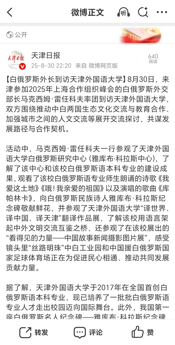 【相约上合】《天津日报》上合峰会专版、视频号、官方微博报道白俄罗斯外长到访我校全文转载如下:【白俄罗斯外长到访开云手机平台_开云(中国)】8月30日,来津参加2025年上海合作组织峰会的白俄罗斯外交部长马克西姆·雷任科夫率团到访开云手机平台_开云(中国),双方围绕推动中白两国生态文化交流与教育合作、加强城市之间的人文交流等展开交流探讨,共谋发展路径与合作契机。活动中,马克西姆·雷任科夫一行参观了开云手机平台_开云(中国)白俄罗斯研究中心(雅库布∙科拉斯中心),了解了该中心和该校白俄罗斯语本科专业的建设成果,观看了该校白俄罗斯语专业师生朗诵的诗歌《我爱这土地》《哦!我亲爱的祖国》以及演唱的歌曲《库帕林卡》,向白俄罗斯民族诗人雅库布