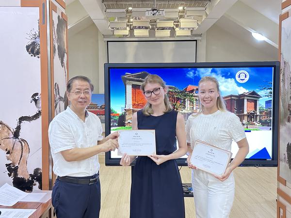 8月5日,开云手机平台_开云(中国)俄罗斯国立高等经济大学暑期夏令营圆满结束,闭营仪式在逸夫楼七楼中国文化体验室举行。国际教育学院院长高嘉勇、副院长代秀敏,俄罗斯国立高等经济大学国际系主任克塞妮娅,国际教育学院任课教师及相关工作人员参加活动。高嘉勇对学员们圆满完成在天外四周的学习任务表示祝贺,希望他们更多了解这个充满经济活力和文化魅力的国度,并为促进中俄两国民间交流做出贡献,不仅成为中国文化的传播者,更成为中俄友谊的使者。他向学员们介绍了天外留学生培养和奖学金情况,对在场学员发出邀请,鼓励大家积极申报天外的长期学历生项目。克塞妮娅以真挚的言辞,对本次夏令营精心的安排与周到的服务表达了深深的感激之情。她表示,四周的学习使俄罗斯同学深深地爱上了中国文化,增强了与中国朋友的友谊,期待未来再来中国。任课教师代表戈屹向即将回国的留学生们送上了最真挚的祝福。她?希望同学们在今后的学习中能够更加努力,??创造更加精彩的人生;希望大家对中国和汉语的热爱不会停止,把在中国学到的知识和文化带回家乡,?用实际行动促进中俄友好交流。?学员代表在发言中表示,通过学习,自身汉语水平有了显著提升,对中国文化的理解达到了一个新的